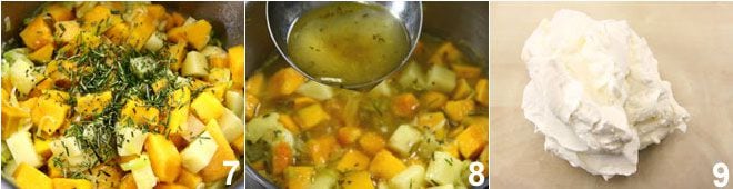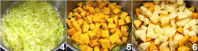 En una cacerola, caliente 4 cucharadas de aceite de oliva virgen extra, sofría el puerro 4 y añada los trozos de calabaza 5 y de patatas 6,