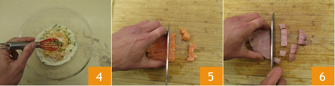 Mezclad con un batidor y reservad 4. Aseguraos de que no haya espinas en el salmón y cortadlo en cubos de aproximadamente 2 cm 5. Quitad la piel del pez espada y cortadlo también en cubos del mismo tamaño 6.