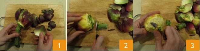 Para preparar las alcachofas rellenas, pon una olla con agua salada al fuego que servirá para el Caldo de verduras. Procede entonces con la Cómo limpiar las alcachofas; la primera operación importante es frotarse las manos con un limón para evitar que las sustancias dentro de este vegetal te ennegrezcan las manos (alternativamente, puedes usar guantes de látex). Deshoja la alcachofa, es decir, elimina las hojas exteriores más duras, y continúa hasta llegar a las más tiernas 1. Una vez alcanzado el corazón, elimina el tallo (2-3).