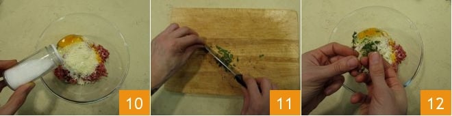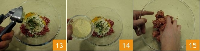 Macha el diente de ajo 13 y por último, añade también el pan rallado 14; mezcla todo con las manos enérgicamente de manera que se integren bien los ingredientes 15.