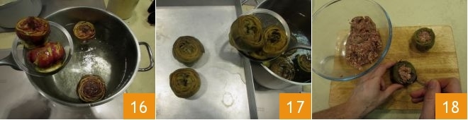 Pon al fuego una olla con abundante agua salada y hierve las alcachofas durante 10 minutos 16; una vez listas, escúrrelas y déjalas templar sobre una bandeja 17. Luego, rellena cuidadosamente las alcachofas con 3 cucharaditas del relleno de carne que preparaste, teniendo cuidado de no romperlas 18.