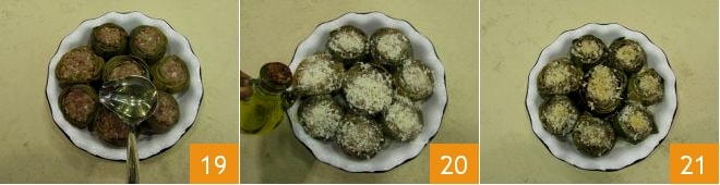 Una vez terminado, distribuye las alcachofas rellenas en un molde o fuente para horno una al lado de la otra y rocíalas con el caldo de verduras 19. Termina distribuyendo una pizca de pan rallado y un chorrito de aceite de oliva en la superficie 20; cocínalas en horno estático precalentado a 180°C durante 25 minutos (o a 160°C durante 15 minutos si es en horno ventilado), finalmente pásalas bajo la parrilla durante 5 minutos para obtener un dorado crujiente en la superficie. Cuando estén listas, sácalas del horno y sirve tus alcachofas rellenas 21.