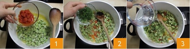 Para preparar las casarecce con puré de habas, sofría una cebolla finamente picada en una cacerola antiadherente, con un poco de aceite durante un par de minutos a fuego bajo. Cuando la cebolla esté dorada, agregue las habas congeladas, la pulpa de tomate 1, el hinojo picado 2 y el agua fría 3, que habréis salado previamente.