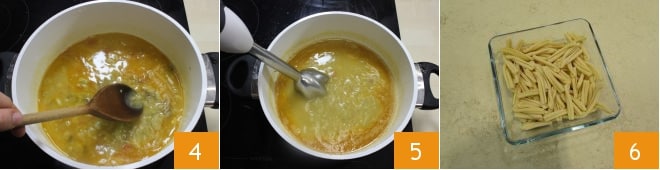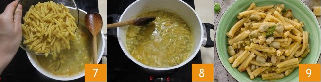 y viértala dentro del puré de habas 7; cocine siempre a fuego bajo y remueva de vez en cuando 8. Al final de la cocción, sazone con un chorrito de aceite de oliva virgen extra crudo; sirva las casarecce con puré de habas acompañándolas con picatostes de pan caliente 9.
