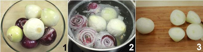Para preparar las cebollas al horno, comienza pelando y limpiando las cebollas 1, luego hiérvelas durante 7/8 minutos en abundante agua salada 2. Escúrrelas y córtalas por la mitad con un cuchillo afilado 3.