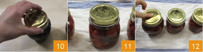 Cierra bien los frascos 10: si utilizas tarros con tapas de rosca, enrosca bien las tapas, pero sin apretar excesivamente 11. En este punto puedes proceder a la ebullición: es decir, la pasteurización, siguiendo las indicaciones mencionadas en las guías del Ministerio de Salud citadas al final de la receta. Si utilizas tarros con tapas de rosca, una vez que los tarros se hayan enfriado, verifica si el vacío se ha realizado correctamente: puedes presionar en el centro de la tapa y, si no escuchas el clásico "click-clack", el vacío se habrá realizado 12. Si utilizas tarros con cierres de goma, al momento de consumir las cerezas, puedes hacer la prueba del vacío tirando de la lengüeta correspondiente: si al tirar produce un sonido seco, significa que el contenido se ha conservado con el vacío correcto. Al contrario, si al tirar de la lengüeta la goma resulta "floja", significa que no se ha creado el vacío correctamente y es mejor no consumir su contenido.