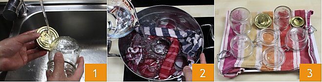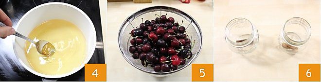 Para preparar las cerezas en almíbar con Oporto y canela, primero debes conseguir frascos de vidrio para la conserva y proceder con su esterilización como indicado en las guías del Ministerio de Salud mencionadas al final de la receta. Empieza lavando cuidadosamente los frascos bajo agua corriente 1. Forra una olla ancha de bordes altos con un paño limpio y coloca los frascos dentro de la olla. Luego coloca alrededor de los frascos uno o más trapos para evitar golpes 2. Llena la olla de agua hasta cubrir los frascos. Lleva a ebullición, luego baja el fuego y deja los frascos en la olla otros 30 minutos. Diez minutos antes de escurrir los frascos, sumerge también las tapas para esterilizar. Pasado el tiempo necesario, apaga el fuego y deja enfriar. Cuando el agua esté a temperatura ambiente, saca los frascos de la olla y deja que escurran sobre un paño 3.