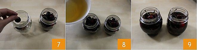 Envasa también las cerezas 7 dejando unos 2 cm de espacio desde el borde y tratando de colocarlas de manera que queden los menos espacios vacíos posibles, pero sin aplastarlas demasiado. Ahora añade el almíbar de Oporto 8 asegurándote de cubrir completamente las cerezas pero deteniéndote a 1 centímetro de espacio desde el borde 9. Con las dosis indicadas, obtendrás tres frascos de 250 ml de capacidad.