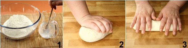 Pon en un bol 240 g de harina para chapati (como alternativa puedes utilizar 160 g de harina integral y 80 g de harina común), disuelve la sal en el agua a temperatura ambiente 1 y viértela posteriormente en la harina poco a poco. Con la ayuda de una cuchara, o con los dedos, amasa la harina con el agua; luego continúa trabajando la masa sobre una superficie durante al menos 10 minutos, hasta obtener una masa firme y lisa 2, luego forma una bola, colócala en un bol, cúbrela y déjala reposar durante 20 minutos. Transcurrido el tiempo de reposo, dale a la masa una forma alargada 3.