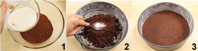 Para preparar la tarta de queso al triple chocolate comenzad preparando la base: poned las galletas de cacao en la batidora y trituradlas finamente. Derretid la mantequilla en un cazo; mientras tanto, poned las galletas trituradas en un bol y añadid poco a poco la mantequilla derretida 1 mezclando bien todo. Engrasad un molde, preferiblemente desmontable, de 22 cm de diámetro; en este punto, podréis forrar el molde con papel de horno: cortad un disco de papel del mismo diámetro del fondo del molde y dos tiras de la misma altura de los bordes, luego forrad el molde. Verted las galletas trituradas en el molde forrado con papel de horno 2 y con la ayuda de una cuchara compactad bien la base de galleta 3. Dejad enfriar la mezcla en el frigorífico durante media hora o en el congelador durante unos diez minutos.