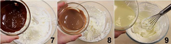 e incorporadlos en cada bol que contiene el queso crema mezclando hasta obtener una mezcla cremosa (7-8-9) .