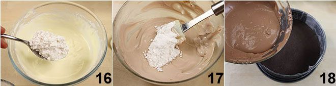 Haced la misma operación para todos los tipos de chocolate (16-17). Ahora que las cremas están listas, podéis montar la tarta de queso, sacad del frigorífico la base de galleta ya fría y compacta, comenzad vertiendo primero la crema de chocolate negro 18, dejad reposar en el frigorífico o congelador durante 15-20 minutos.