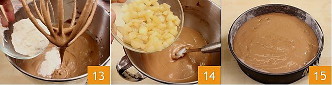 Mientras las batidoras están en funcionamiento, agrega también la leche poco a poco. Mezcla bien todo y agrega la maicena tamizada 13. Cuando la mezcla tenga un aspecto suave y homogéneo, apaga la batidora de pie y añade las peras y mezcla con una espátula 14. Tu crema de queso con chocolate estará lista. Saca del frigorífico la base de galleta que ya estará firme y rellénala con la crema 15. Déjala cocinar en el horno estático durante una hora a 170° (si usas un horno ventilado, cocina a 150° durante 50 minutos). Una vez que la cheesecake esté cocida, déjala enfriar durante 4 horas en el frigorífico. Con la pera que guardaste para la decoración, adorna el pastel como prefieras, por ejemplo, cortando la pera en rodajas finas y disponiéndolas en forma de abanico.