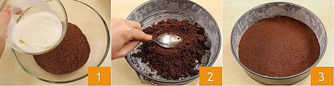 Para preparar la cheesecake selva negra, comenzad preparando el fondo: poned las galletas secas de cacao en el procesador, picadlas finamente y transferidlas a un bol. Derretid la mantequilla en una cacerola o en el microondas y añadidla poco a poco a las galletas 1, mezclando para amalgamar bien todo. Engrasad un molde, preferiblemente desmontable, de 22 cm de diámetro y forradlo con papel de horno (para ver cómo hacerlo, mirad aquí nuestra Escuela de Cocina: forrar un molde con papel de horno). Verted las galletas trituradas en el molde y con el dorso de una cuchara compactad bien la base de galleta 2. Enfriad la base 3 en el frigorífico durante media hora o en el congelador durante 15 minutos.