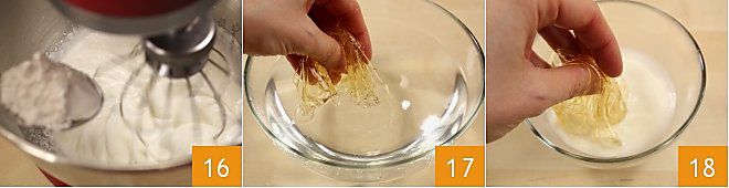 Mientras tanto, ocupáos de la crema de nata: en una batidora equipada con varillas, o con una batidora eléctrica, montad a punto de nieve la nata (aquí la Escuela de Cocina: cómo montar la nata), dejando aparte 1-2 cucharadas para disolver la gelatina, con 1 cucharada de azúcar glas 16; reservad un par de cucharadas de nata montada para la decoración final. Suavizad 8 g de gelatina en agua fría, escurridla 17 y disolvedla en 1-2 cucharadas de nata caliente 18.