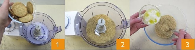 Para preparar la tarta de queso ligera empieza preparando la base: coloca las galletas integrales en la batidora 1, luego pícalas finamente 2. Coloca las galletas picadas en un bol. Ahora derrite la mantequilla en un cazo y añade poco a poco la mantequilla derretida en el bol donde has puesto las galletas picadas 3, mezclando bien todo hasta obtener una mezcla arenosa.