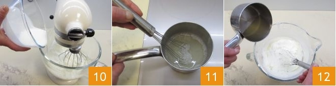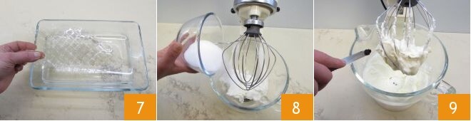 Ahora dedícate al relleno: ablanda en agua fría la gelatina en hojas durante unos 10 minutos, luego escúrrela bien 7. Mientras tanto, coloca el queso crema en un bol mezclador, añade el fructosa 8 y acciona las varillas para mezclar los ingredientes. Luego añade las semillas de la vaina de vainilla 9.