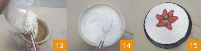 En este punto la crema está lista, viértela sobre la base de galleta 13, ya fría y compacta. Extiende la crema para nivelarla 14. Luego coloca tu tarta de queso ligera en el frigorífico durante al menos 4 horas para que se endurezca 9 y luego sírvela!