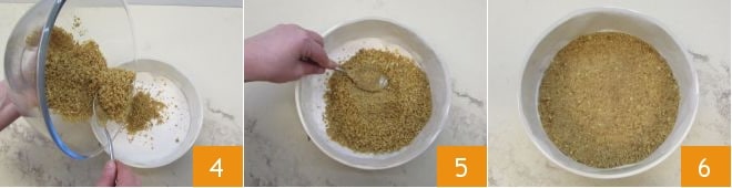Unta con mantequilla un molde desmontable de 24 cm de diámetro; corta un disco de papel para horno del mismo diámetro que la base del molde y dos tiras de la misma altura que los bordes, luego forra el molde. Vierte las galletas trituradas en el molde forrado con papel de horno 4 y con la ayuda de una cuchara compacta bien la base de galleta 5. Deja enfriar la mezcla en el frigorífico durante media hora o en el congelador durante unos diez minutos 6.