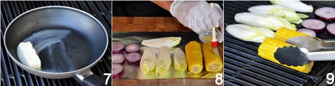 Precalienta la barbacoa a la máxima temperatura y mientras tanto corta las endibias a lo largo y las cebollas en anillos. Las mazorcas se cocinarán enteras y luego se desgranarán al final. Una vez preparados los vegetales, funde una cucharada de mantequilla 7 que usarás para pintar los vegetales 8. Asa los vegetales a fuego alto durante unos segundos, justo para mantener casi inalterada su estructura proporcionando sabor mediante las clásicas líneas de la parrilla 9.