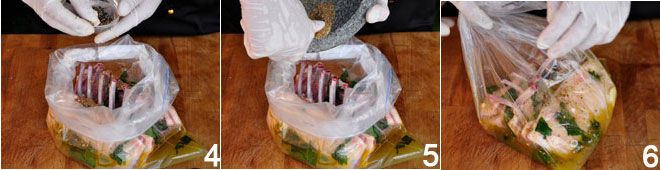 Se comienza con la marinada del carré. En una bolsa de plástico para alimentos, con cierre de cremallera (se encuentran en todos los supermercados) vamos a introducir, después de la carne, el jugo de manzana 1, jugo de lima 2, las hojas de menta desmenuzadas con las manos 3,