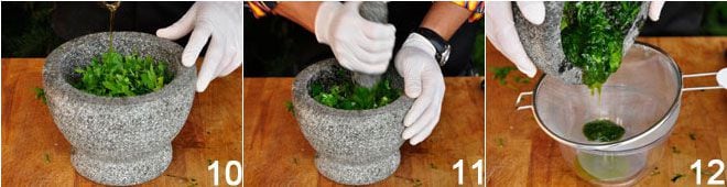 Mientras tanto, prepara un aceite de perejil simplemente picando un buen manojo, cuidando de dejar también los tallos, que luego pondrás en un mortero añadiendo aceite 10; machaca los ingredientes 11, junto con una pizca de sal gruesa. Al final filtra todo 12 sin presionar para evitar que el aceite quede opaco.