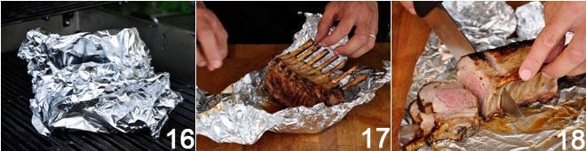 Cuando la superficie está bien sellada, retira del fuego y envuelve la carne en una triple capa de aluminio que colocarás en la barbacoa 16 pero lejos de la fuente de calor. Si tienes una barbacoa con tapa, recuerda mantenerla cerrada. Deja cocinar por el tiempo indicado, retira del fuego y deja la carne envuelta reposar durante al menos 10 minutos para permitir una redistribución de los jugos. Retira la carne del aluminio 17 corta las chuletas 18 y sirve 3 por persona, junto con las verduras asadas y las mazorcas que habrás desgranado previamente. Rocía con el aceite de perejil y añade un poco del líquido de cocción que recuperarás del paquete de aluminio. Espolvorea aún con sal mineral (sal negra, roja o también sal gruesa) y sirve bien caliente.