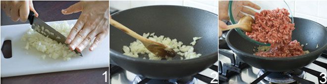 Corta la cebolla finamente 1. En una sartén grande sofríe la cebolla hasta que esté transparente 2. Agrega la carne y sofríela hasta que esté dorada 3.