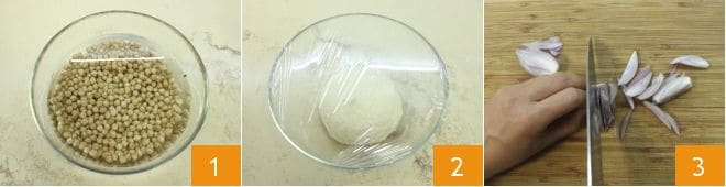 Para preparar el cuenco de pan con crema de garbanzos, comienza poniendo los garbanzos secos a rehidratar la noche anterior: colócalos en un bol, cúbrelos con agua y déjalos reposar durante 12 horas 1. También puedes usar garbanzos cocidos, así saltarás este paso. Luego dedícate a la preparación de la masa de pan, consultando nuestra Escuela de cocina: Masa para el pan; alternativamente, puedes usar 10 g de levadura fresca. Una vez formada la masa, dale una forma redonda, trasládala a un bol, cúbrelo con film y deja leudar en un lugar seco y templado durante aproximadamente 1 hora, 1 y media 2, hasta que haya duplicado su volumen. Luego pela y pica finamente la chalota 3.