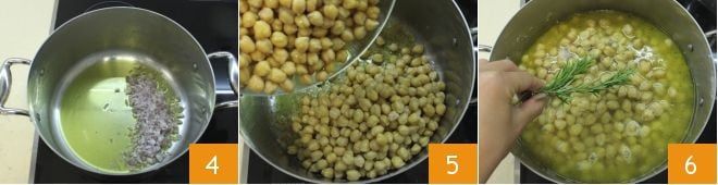 Calienta un poco de aceite en una cacerola con bordes altos y dora la chalota picada 4. Transcurrido el tiempo necesario para su rehidratación, escurre los garbanzos, que se habrán ablandado, y viértelos en la cacerola 5. Dora los garbanzos durante un par de minutos a fuego medio, luego cubre con el caldo de verduras (para descubrir cómo prepararlo y conservarlo mejor, consulta nuestra Escuela de cocina: Caldo de verduras) y añade 2 ramitas de romero para aromatizar 6.