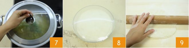 Cubre la cacerola con una tapa y deja cocinar a fuego lento durante aproximadamente 2 horas y media 7. Mientras tanto, dedícate a la preparación de los cuencos: una vez que la masa de pan haya duplicado su volumen 8, retira el film, transfiérela a una superficie ligeramente enharinada y trabaja con un rodillo, hasta obtener una lámina redonda de aproximadamente medio centímetro de espesor 9. Divídela en cuatro partes, ayudándote con un cortapastas.