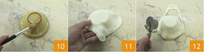 En este punto, toma 4 cuencos de barro o vidrio resistente a altas temperaturas con un diámetro de 10 cm, colócalos boca abajo en la superficie de trabajo y unta la superficie exterior con aceite, utilizando un pincel 10. Luego coloca la masa sobre los cuencos 11, haciéndola adherir bien y eliminando las partes sobrantes con un cortapastas 12.