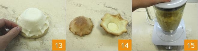 Moldea los bordes de los cuencos, formando pliegues 13, luego hornea en horno estático precalentado a 200° durante 15 minutos, hasta que la superficie esté ligeramente dorada, si usas horno con ventilador, cocina a 180° durante 10 minutos. Luego desmolda las masas y colócalas dentro de los cuencos, para que también se cocine la parte interna 14. Vuelve a meter en el horno siempre a 200° durante 10 minutos o a 180° durante 5 minutos si cocinas en horno con ventilador. Mientras los cuencos de pan se hornean, retira las ramitas de romero de la sopa de garbanzos y transfiere todo a una licuadora 15.