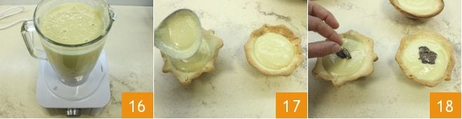 Acciona durante unos segundos, hasta obtener una mezcla lisa y homogénea 16. Ahora vierte la crema de garbanzos dentro de los cuencos 17 y decora con escamas de trufa negra 18. ¡Tus cuencos de pan con crema de garbanzos están listos para ser servidos calientes!