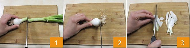 Para preparar el clafoutis de salmón, empieza limpiando el cebollino fresco: corta el tallo 1, elimina la base 2 y pícalo finamente 3.