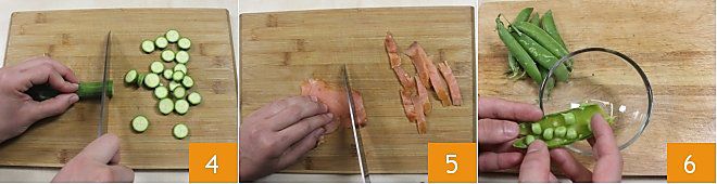 Lava con cuidado los calabacines baby, límpialos eliminando los dos extremos y luego córtalos en rodajas 4. Pon sobre la tabla el filete de salmón, córtalo en tiras y consérvalo en el frigorífico hasta el momento de usarlo 5. Luego desenvaina los guisantes frescos, eliminando la vaina y transfiérelos a un bol pequeño 6; necesitarás 100 g de guisantes desgranados.