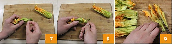 Después toma las flores de calabacín, lávalas sumergiéndolas delicadamente en agua fría, luego escúrrelas y ponlas a secar sobre un paño seco con el cual las secarás ligeramente. Transfiérelas a una tabla y elimina las protuberancias en la base del cáliz 7. Extrae los pistilos carnosos situados en el interior 8 y divide las flores por la mitad 9. Resérvalas en el frigorífico, las añadirás justo antes de hornear el clafoutis.
