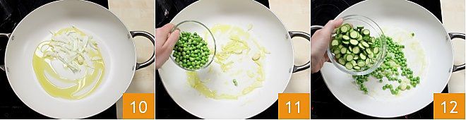 En una sartén antiadherente, calienta un poco de aceite y deja dorar un diente de ajo pelado, luego añade el cebollino picado 10 dejando que se sofría. Añade también los guisantes desgranados y los calabacines baby cortados en rodajas (11-12). Deja cocinar a fuego lento durante unos 20 minutos.