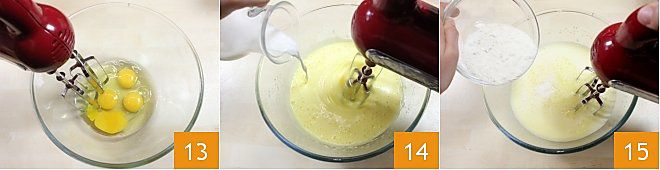 Mientras tanto, prepara la mezcla del clafoutis: rompe los huevos en un bol y bátelos con una batidora eléctrica hasta montarlos bien 13. Luego añade la leche en hilo 14 y finalmente la harina 15. Sala y pimienta la masa al gusto.