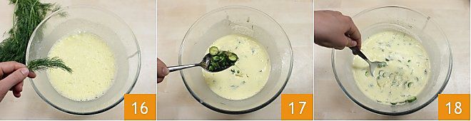 Añade el eneldo a la mezcla, desmenuzándolo con las manos 16, luego vierte dentro las verduras cocidas 17 y mezcla para amalgamar la masa 18.