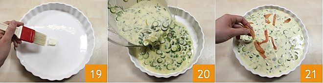 En este punto, unta con mantequilla un molde bajo de 26 cm de diámetro 19. Vierte la mezcla en el molde 20, saca del frigorífico el salmón en tiras y colócalo a tu gusto sobre la mezcla 21.