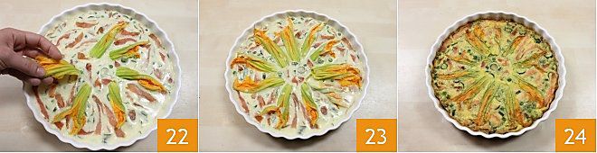 Ahora decora con las flores de calabacín que has limpiado y dividido: colócalas en forma de radial sobre la mezcla 22. Una vez decorado 23, solo queda hornear el clafoutis en horno ya caliente a 180° durante 30 minutos (si usas horno con ventilación, cocina a 160° durante 20 minutos). Cuando la superficie esté agradablemente dorada, ¡tu clafoutis de salmón estará listo para ser desmoldado y servido caliente 24!
