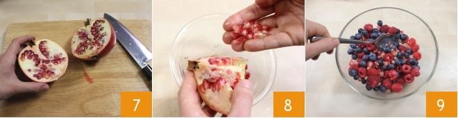 Limpia ahora la granada, córtala por la mitad 7 y desgránala bien 8, luego añade los granos jugosos a las frutas rojas, en un bol, mezclando todo 9.