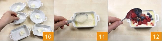 Corta la mantequilla restante en trocitos (80 gr), ponla en las cocottes y derrítela en el microondas 10 (si no tienes, puedes derretir la mantequilla en un cazo a fuego bajo y verterla posteriormente en los moldes). Ahora coloca unos 70 gr de masa en el fondo de cada cocotte 11, añade 50 gr de frutas rojas 12