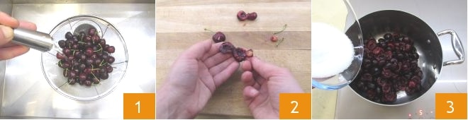 Para preparar la compota de cerezas y vainilla, primero lava cuidadosamente las cerezas con agua fría 1. Escúrrelas y quítales el hueso y el rabillo 2 y colócalas en una cacerola de fondo grueso, añadiendo también el azúcar 3.