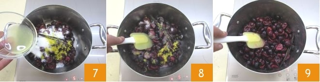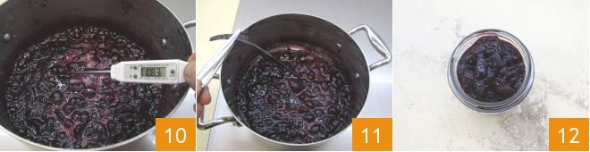 Continúa así la cocción durante unos 40 minutos, o hasta que la compota alcance la temperatura de 108° 10: en ese momento estará lista. Retira la vaina de vainilla 11 y transfiere la compota de cerezas y vainilla a un recipiente 12.