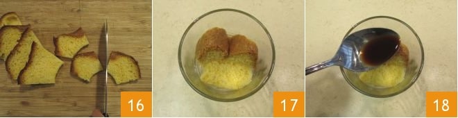 Corta en trozos las rebanadas de pandoro, ajustándote en base a la forma de tus vasitos (nosotros hemos utilizado vasitos con capacidad de 20 cl) 16. Todo está listo para componer los postres: coloca 2-3 trozos de pandoro en el fondo del vaso 17, moja con el café 18,