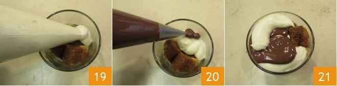 luego exprime una pequeña porción de crema 19. Transfiere también Nutella® a una manga pastelera con boquilla de 6 mm y exprime una pequeña porción en el vaso 20, continúa alternando las capas de crema y Nutella® para crear un efecto variado. Llena hasta el borde las copas y luego sírvelas enseguida 21!