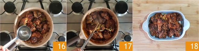Añade si es necesario un poco de agua caliente 16. Finalmente, elimina las hierbas aromáticas 17, comprueba el punto de cocción y quita del fuego. Deja reposar el cordero a la cazadora durante unos minutos antes de servirlo 18.