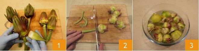 Quitad las hojas externas más gruesas 1 hasta llegar a las tiernas, luego, con un cuchillo, cortad las puntas más duras y también quitadles el tallo 2. Sumergid las alcachofas en el agua con limón 3.